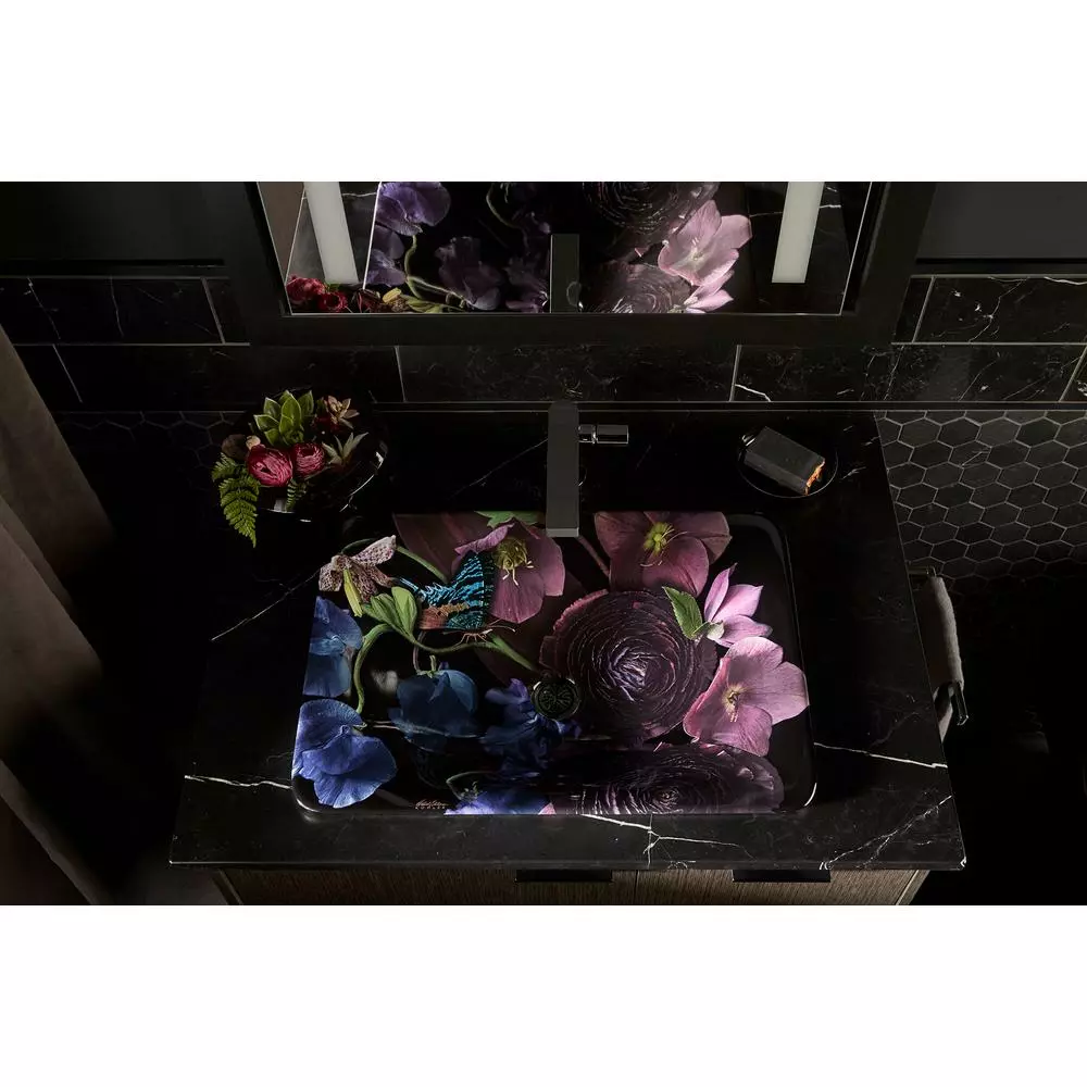 The Dutchmaster collection captures the movement and lush beauty of flowers, bringing bold artistic photography to the bathroom sink. KOHLER collaborated with fluorography artist Ashley Woodson Bailey to create this exquisite floral composition. Inspired by Dutch master paintings of the 17th century, the glorious pattern is abloom with peonies, dahlias, ranunculus and hydrangea, dramatically lit on a dark backdrop in the style of chiaroscuro painting. Rendered on the graceful contours of the Carillon vessel sink, Dutchmaster stands as a bold statement piece in the bath.