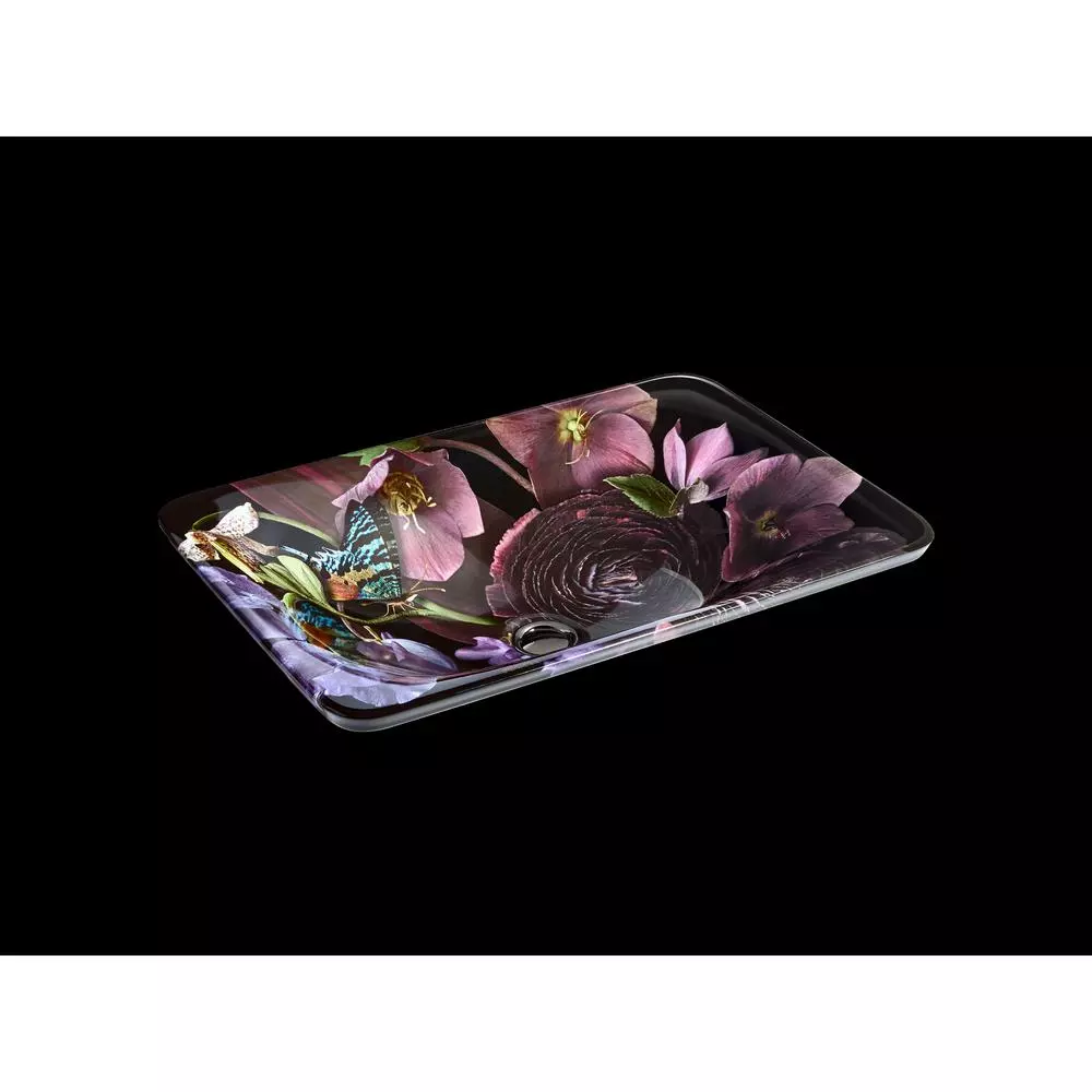- Decorated with a dramatic floral pattern on black background