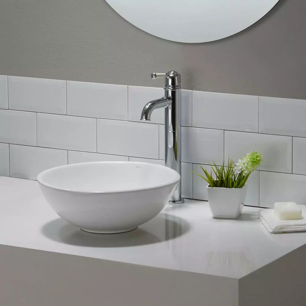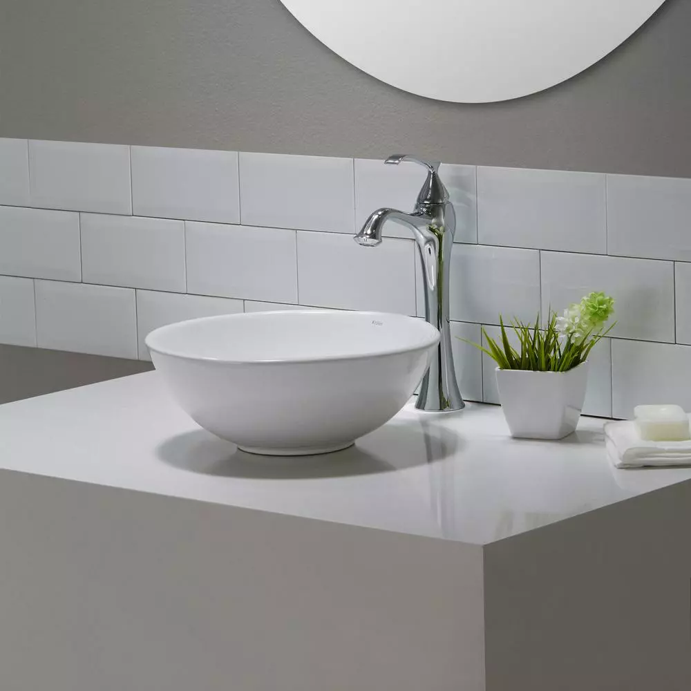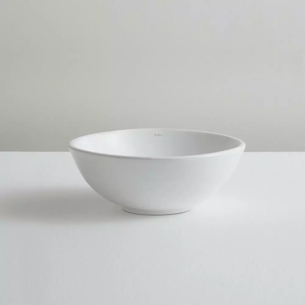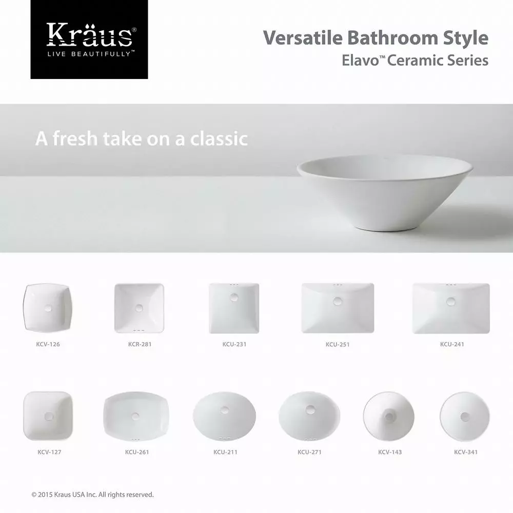 The Elavo Series offers a fresh look for classic white ceramic, with sinks that suit any style, from the traditional to the modern bathroom. This elegant bathroom sink has a streamlined shape and a smooth, non-porous surface with premium baked-on glaze for a high-gloss finish. Simply wipe with a damp cloth to keep your bathroom beautiful with minimal maintenance. Above-counter mounting opens up a world of bathroom design possibilities while maximizing available space on the bathroom vanity. Pair this Kraus sink with any vessel sink faucet for easy coordination and sleek style. Brighten up your bathroom with an Elavo Series sink, and experience Kraus Quality.