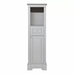 The MagickWoods Libertyville collection boasts a robust furniture design for traditional and transitional baths. The Libertyville linen cabinet provides decorative storage for towels and favorite toiletries with its open shelf, plus concealed storage for bath items big and small. Libertyville is available in 2 beautiful finishes: Deep Mocha and Cloud Gray, which blend seamlessly with any neutral decor, and also mix and match for a unique, personal touch. Both finishes are complemented by elegant brushed nickel hardware. Cabinets are conveniently pre-assembled and easy to install, and include soft-close door hinges and drawer slides for smooth and quiet use. Each cabinet features a decorative open toe-kick with the convenience of a recessed panel behind to avoid items rolling under the cabinet, and ease of floor cleaning. This linen cabinet is designed to pair perfectly with Libertyville vanity bases and medicine cabinets (each sold separately). From bath towels to bottles of shampoo, lotions and more, store all your bath essentials in one place with this linen cabinet.
