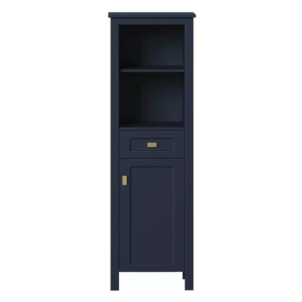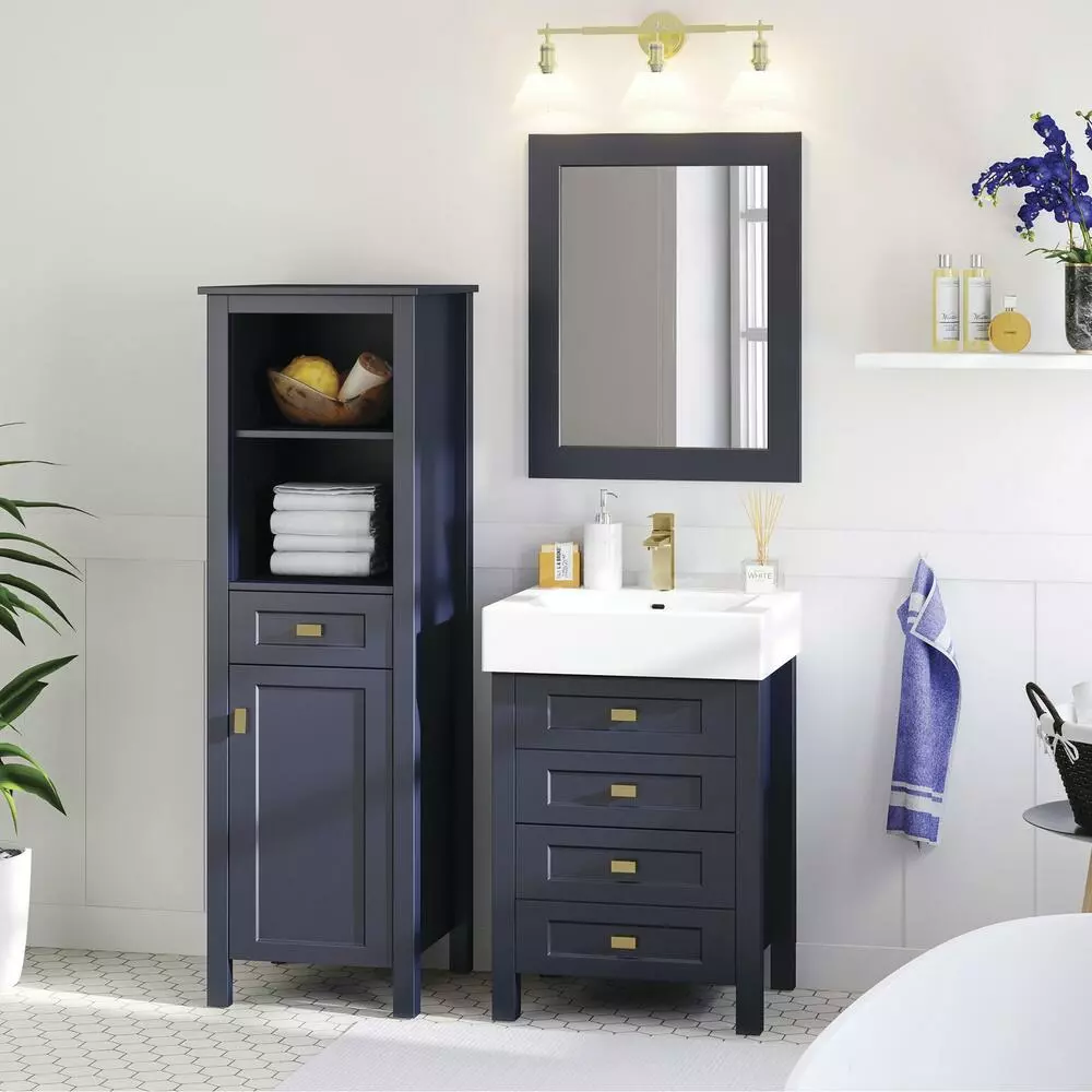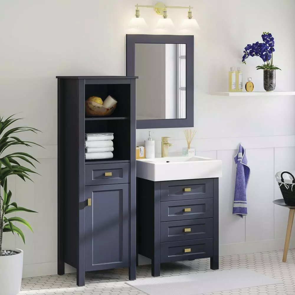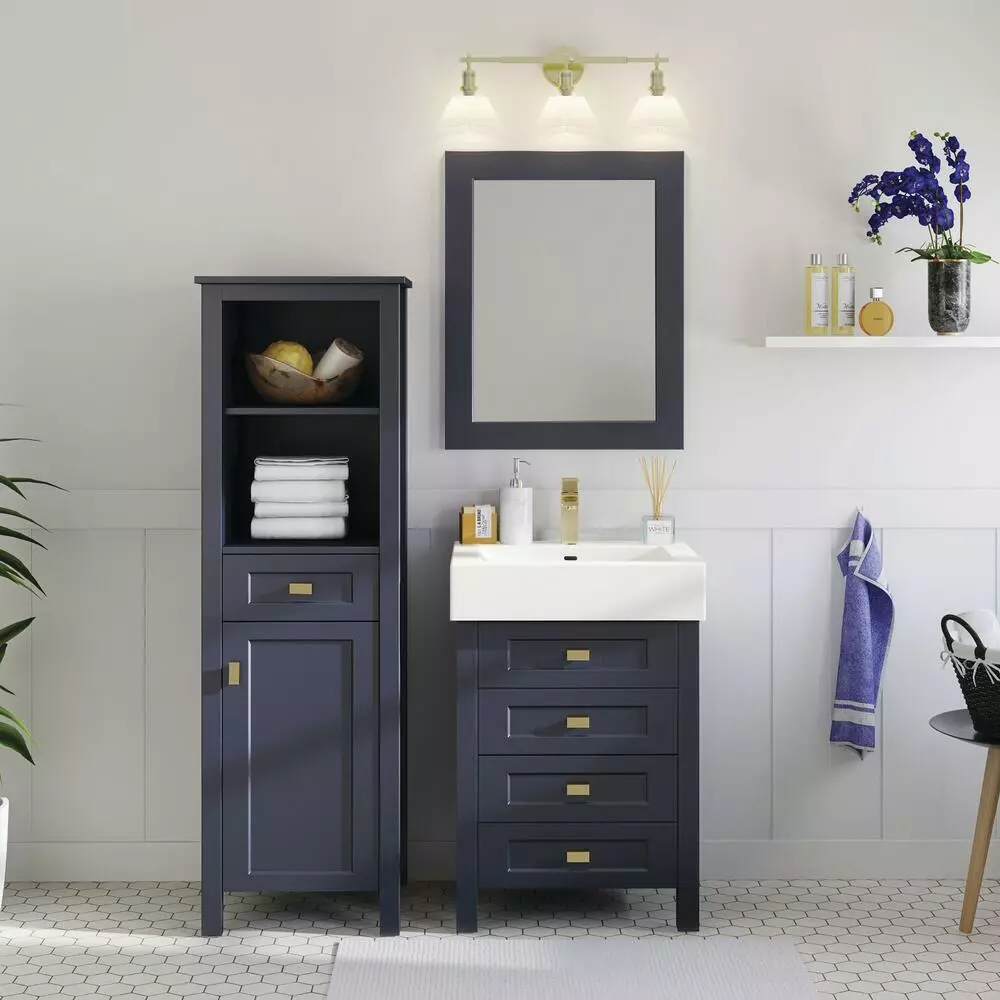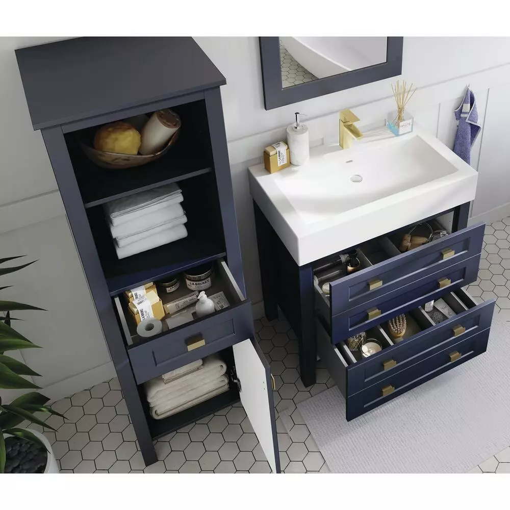 Make a statement. The MagickWoods Montgomery collection offers a classic furniture design in a bold and beautiful midnight blue finish, ideal for traditional and transitional baths. Choose your look: Montgomery includes all cabinet knobs in both matte gold and brushed nickel finishes to compliment multiple decor color schemes. A variety of vanity sizes provides this unique and charming design for spaces big and small. Each vanity base features 2 drawers with the look of 4 drawers, and each bottom drawer is extra-deep with convenient organizer trays to keep toiletries tidy. Soft-close undermount drawers and doors eliminate slamming, creating quiet, peaceful mornings. The simple-designed Montgomery mirror hangs vertically or horizontally and is a perfect addition to any room in your home. Complete the look while adding additional storage: the Montgomery linen cabinet features concealed storage, plus 2 open shelves to hold linens, baskets and favorite toiletries. Montgomery will create an elegant bath space to boast about!