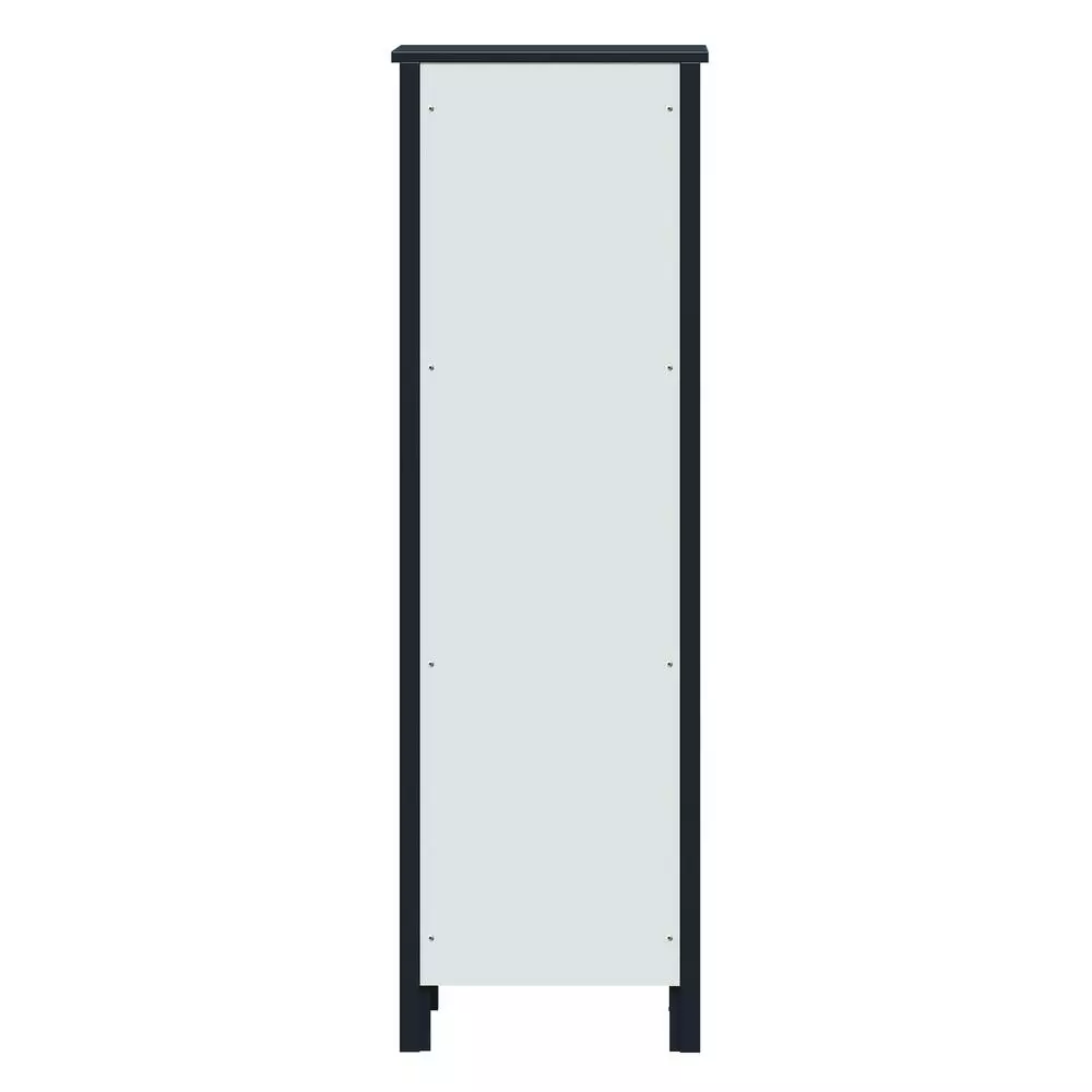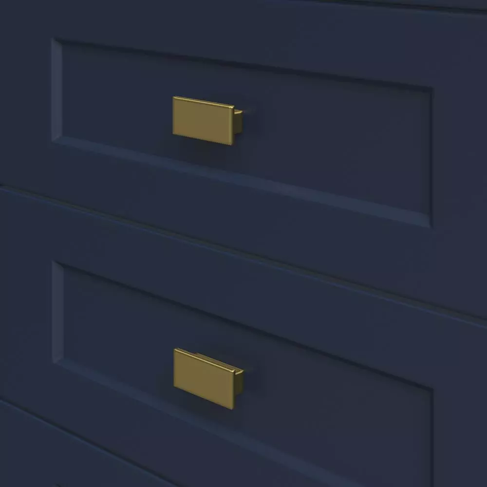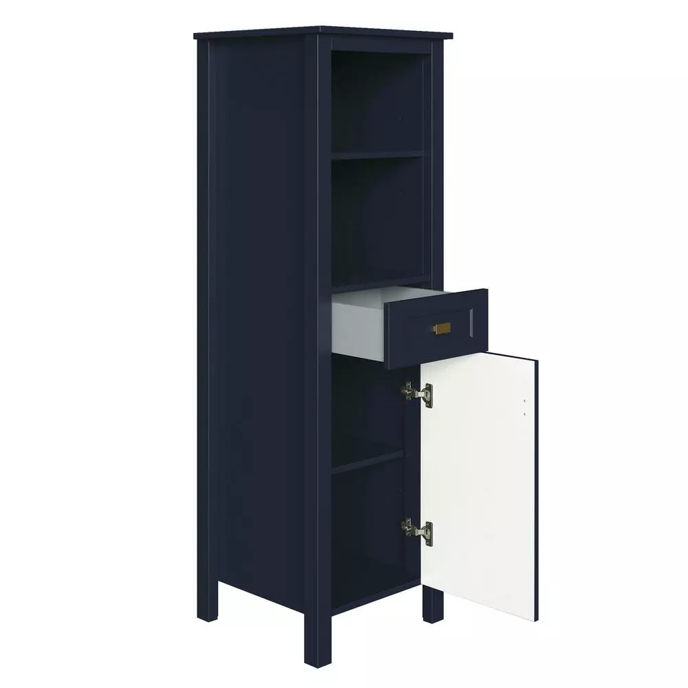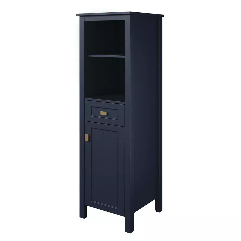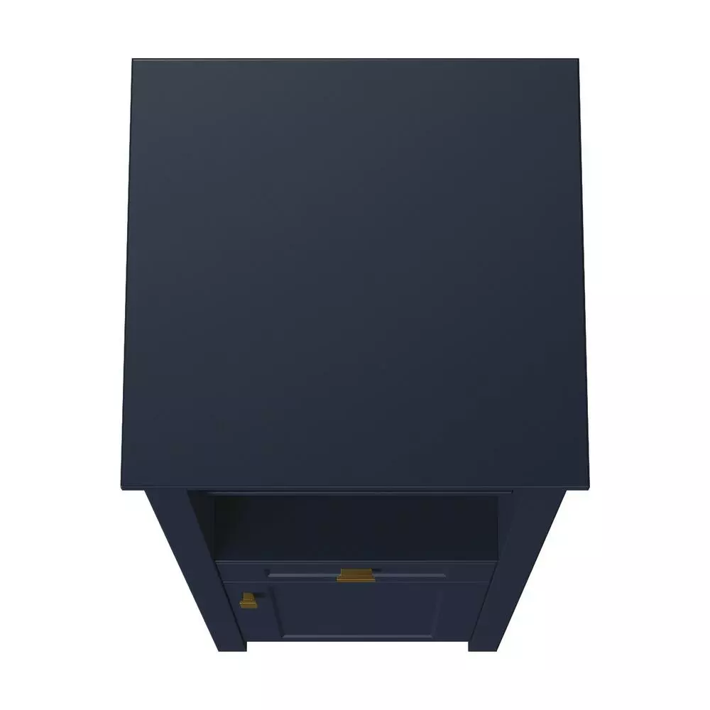 Make a statement. The MagickWoods Montgomery collection offers a classic furniture design in a bold and beautiful midnight blue finish, ideal for traditional and transitional baths. Choose your look: Montgomery includes all cabinet knobs in both matte gold and brushed nickel finishes to compliment multiple decor color schemes. A variety of vanity sizes provides this unique and charming design for spaces big and small. Each vanity base features 2 drawers with the look of 4 drawers, and each bottom drawer is extra-deep with convenient organizer trays to keep toiletries tidy. Soft-close undermount drawers and doors eliminate slamming, creating quiet, peaceful mornings. The simple-designed Montgomery mirror hangs vertically or horizontally and is a perfect addition to any room in your home. Complete the look while adding additional storage: the Montgomery linen cabinet features concealed storage, plus 2 open shelves to hold linens, baskets and favorite toiletries. Montgomery will create an elegant bath space to boast about!