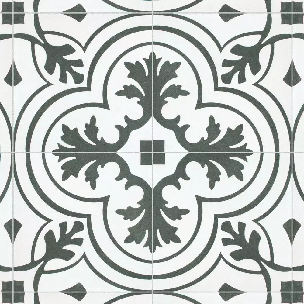 The Merola Tile Twenties Vintage Encaustic 7-3/4 in. x 7-3/4 in. Ceramic Floor and Wall Tile was inspired by artisan cement tiles. The medium-sheen glaze features a vintage floral-inspired pattern in hues of deep charcoal gray on a white background. This tile is perfect for any setting, traditional enough for historical renovations or modern enough for new construction. Use this durable tile with the rest of the geometric patterned Twenties series or as a lively accent for any application to your indoor or outdoor floors and walls.
