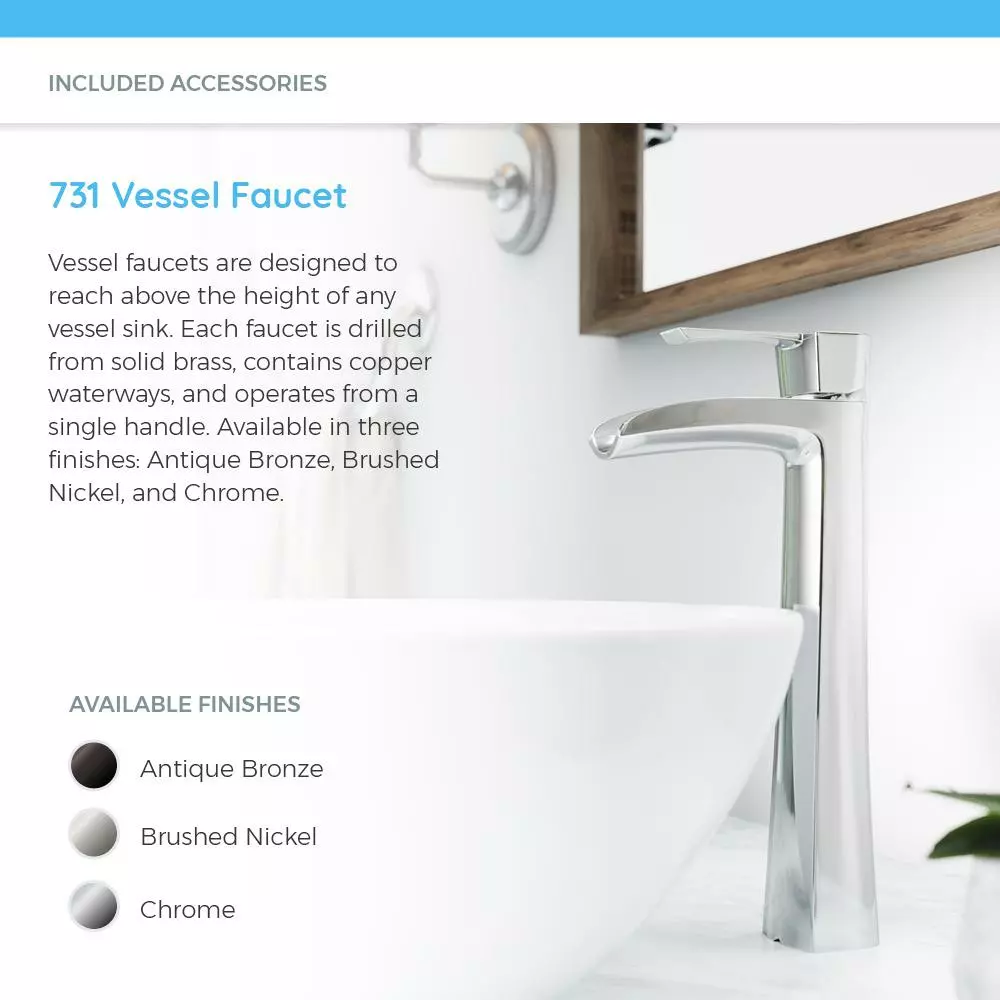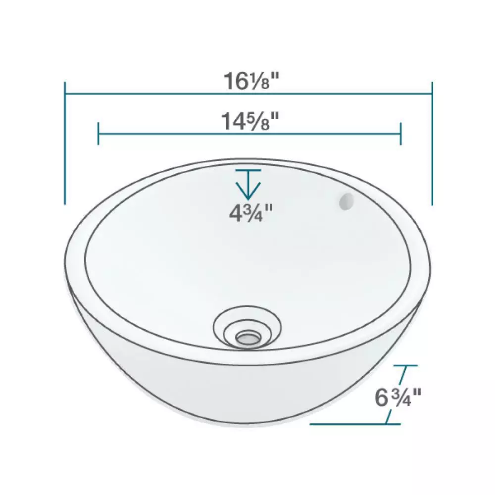 Durability and functionality define this beautiful sink, which presents itself cleanly and simply upon the vanity. As one of the smaller, circular vessel sinks in the porcelain line, it may be the perfect fit in a small bath and comes complete with an overflow. The additional vitreous china coating on this model creates an even more impervious and sanitary surface than standard porcelain. With an overall measurement of 16-1/8 in. x 16-1/8 in. x 6-3/4 in., it will require a minimum-width cabinet of 18 in. The 731-C, single-handle, vessel faucet reaches a height of 12-1/4 in. and features a classic trough-style spout with a 4 in. reach. Its sleek lines gradually widen and contract to create a stunning design statement. The single handle has a flat top with an inverse curve below to mimic the spout design; and it easily sets just the right water flow and temperature. Ceramic disc cartridges assure long-term, dependable operation and a beautiful chrome finish completes its distinctive appearance. The faucet is constructed without lead and is compliant with NSF (National Sanitation Foundation) standards, the Safe Drinking Water Act, the cUPC (Uniform Plumbing Code of the United States and Canada), the ADA (American Disabilities Act) and carries the EPAs WaterSense label. Additionally, a spring-loaded, vessel pop-up drain (vpud) is included, which opens and closes with a simple press to its attractive chrome cap.