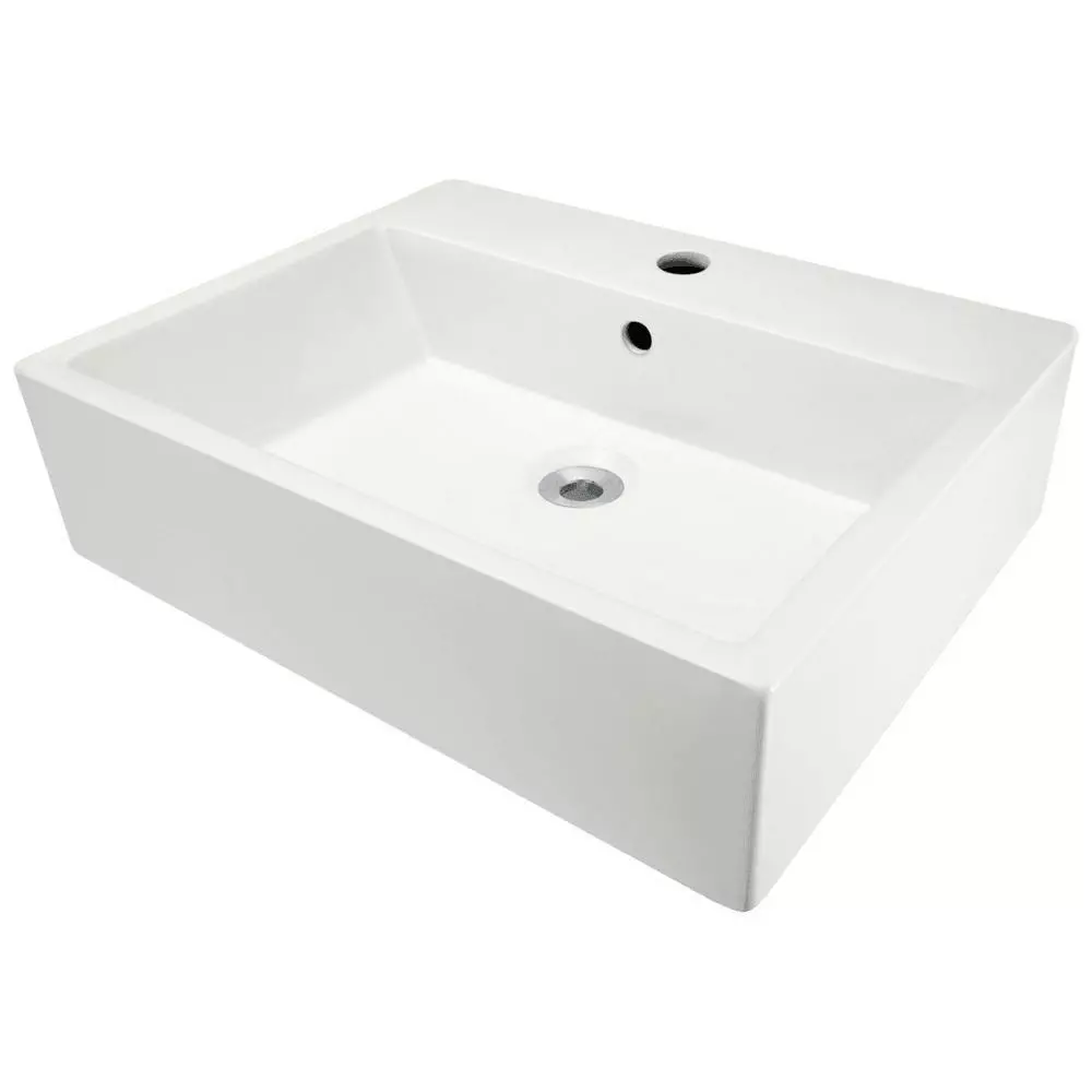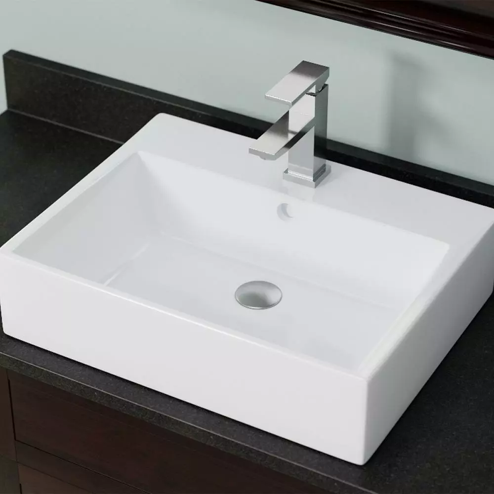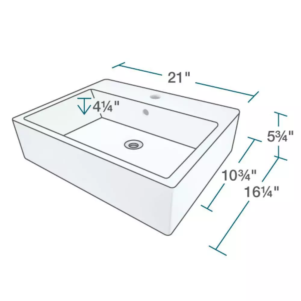 This flat-based, rectangular vessel features 90° corners and a platform with a pre-drilled faucet hole and overflow. The additional vitreous china coating on this model creates an even more impervious and sanitary surface than standard porcelain. With an overall measurement of 21 in. x 16-1/4 in. x 5-3/4 in., it will require a minimum-width cabinet of 21 in. Due to the design of some vessels and their open backs, faucet hardware and unfinished areas may be seen if installed directly in front of a mirrored surface.