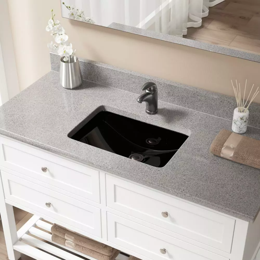A glamorous example of porcelain’s functionality and durability shines in this rectangular, deep-bowl form. Designed to be undermounted, it has an offset drain which allows for more upfront room below the cabinet, and its overflow hole prevents excessive filling. The additional vitreous china coating on this model creates an even more impervious and sanitary surface than standard porcelain. With an overall measurement of 20-3/4 in. x 14-3/4 in. x 7-3/4 in. it will require a minimum-width cabinet of 24 in. Additionally, a spring-loaded, pop-up drain is included, which opens and closes with a simple press to its attractive antique bronze cap.