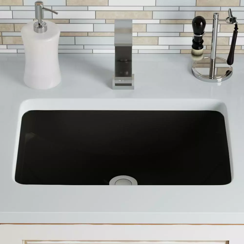 The U1913-Black porcelain undermount sink is made from true vitreous china which is triple glazed and triple fired to ensure your sink is durable and strong. Our bisque color is a beige hue that contains a yellow tint. Undermounting a bathroom sink creates a sleek look and allows for more space on your countertop. The overall dimensions for the U1913-Black are 20-3/4 in. x 14-3/4 in. x 7-3/4 in. and requires a 24 in. minimum cabinet size. Pop-up drains in a variety of finishes are available with this sink model. As always, our porcelain sinks are covered under a limited lifetime warranty for as long as you own the sink.
