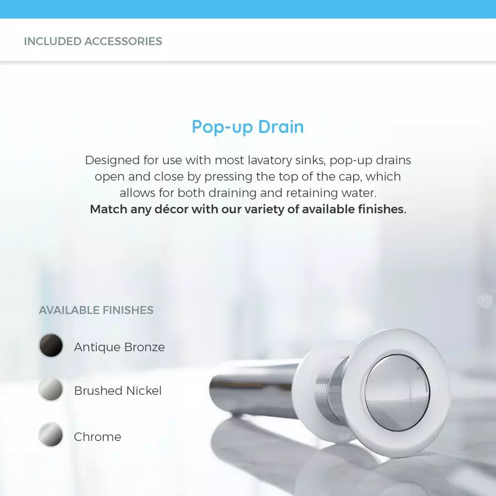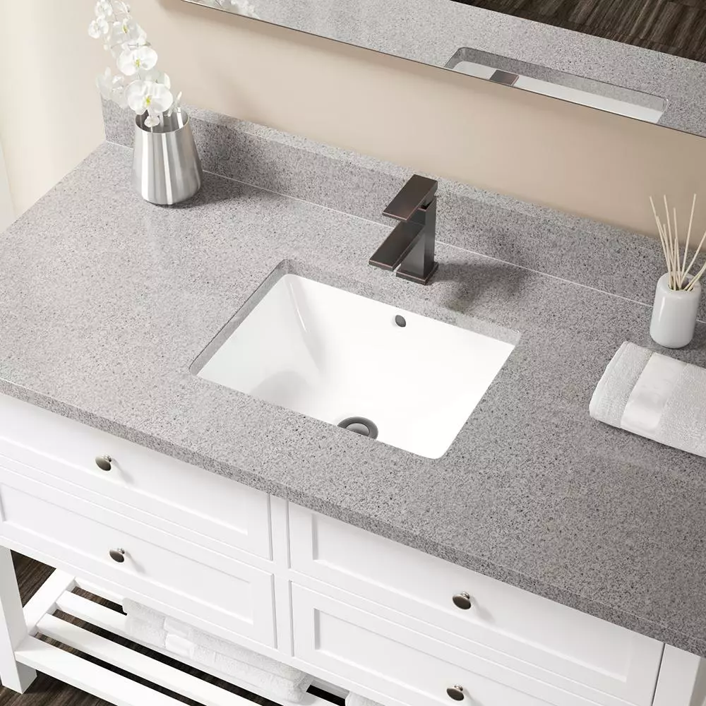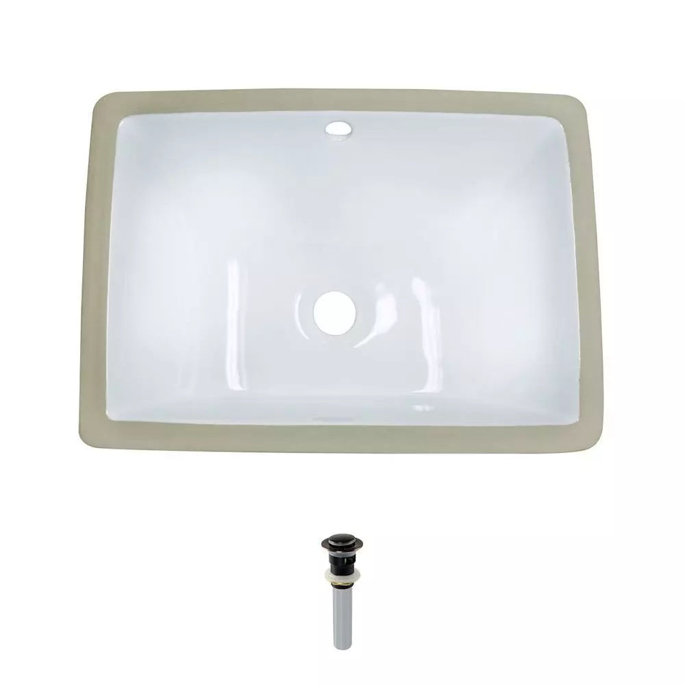 The U1611-White porcelain undermount sink is made from true vitreous china which is triple glazed and triple fired to ensure your sink is durable and strong. Undermounting the bathroom sink creates a sleek look and allows for more space on your countertop. The overall dimensions for the U1611-White are 18-1/4 in. x 13 in. x 7-7/8 in. which require a 21 in. minimum cabinet size. As always, our porcelain sinks are covered under a limited lifetime warranty for as long as you own the sink. Additionally, a spring-loaded, pop-up drain is included, which opens and closes with a simple press to its attractive antique bronze cap.