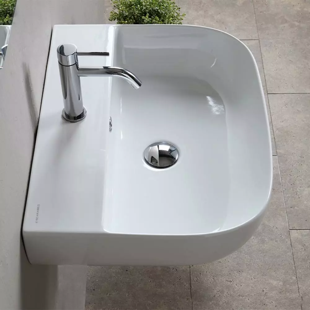Perfect for the modern or contemporary bathroom atmosphere, this 22 inch bathroom sink is made from built-to-last white ceramic with an ultra thin edge. This sink can be used as a wall mounted sink or a vessel sink and is available in one hole option. Made in Italy by Scarabeo and part of the Glam collection.