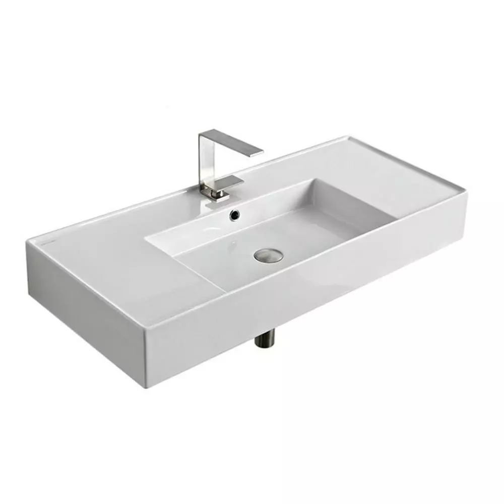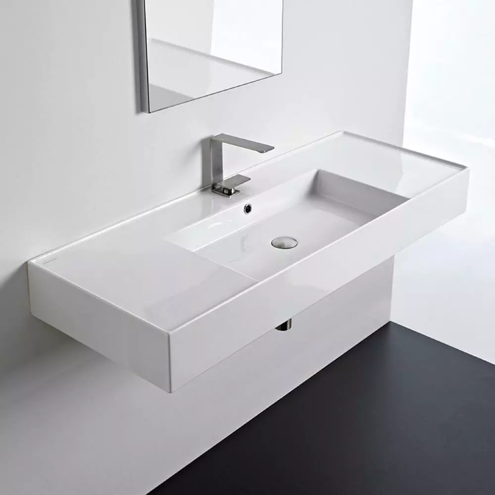 Perfect for the modern or contemporary bathroom atmosphere, this 40 inch bathroom sink is made from built-to-last white ceramic. It comes in the one hole option and can be either wall mounted or vessel installation. It was made in Italy by Scarabeo as part of their Teorema 2.0 collection.