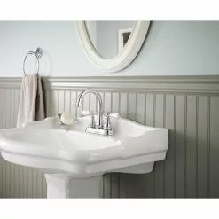Polished chrome finish centerset bathroom faucet from the Sonterra collection offers an elegant, antique look