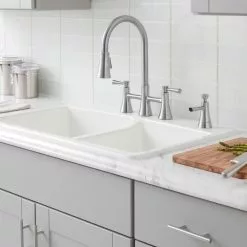 In Stock Hardwarestore Delivery Selma 2-Handle Pull-Down Sprayer Bridge Kitchen Faucet With Soap Dispenser In Stainless Steel