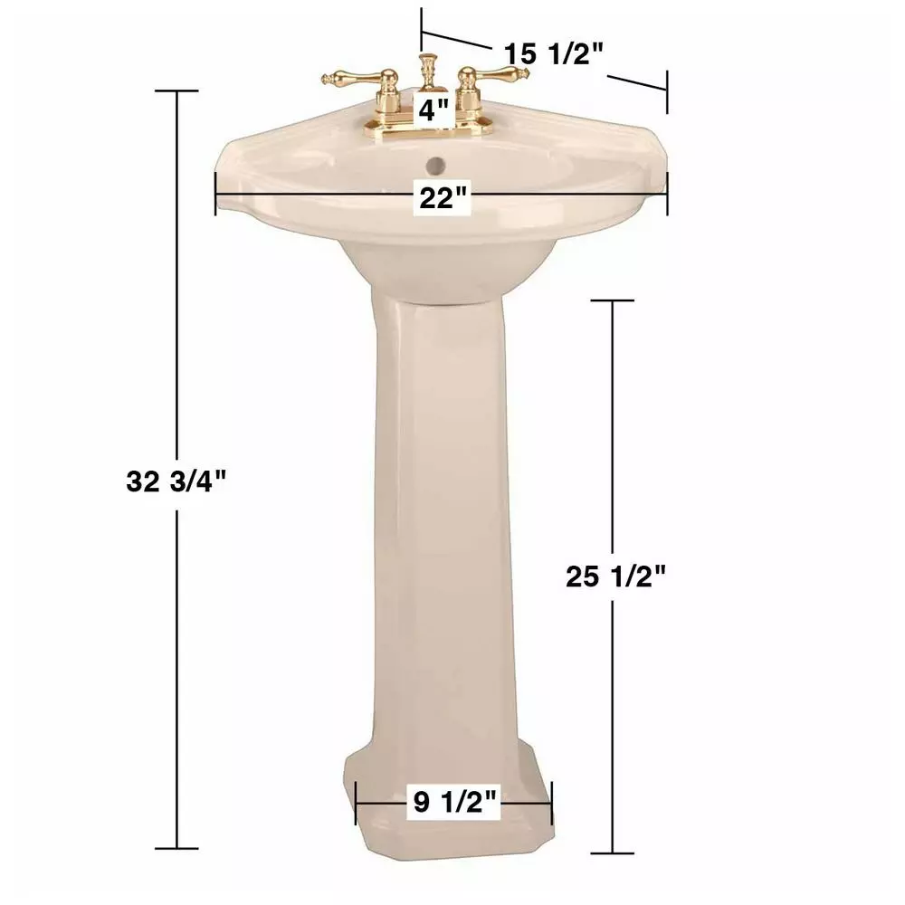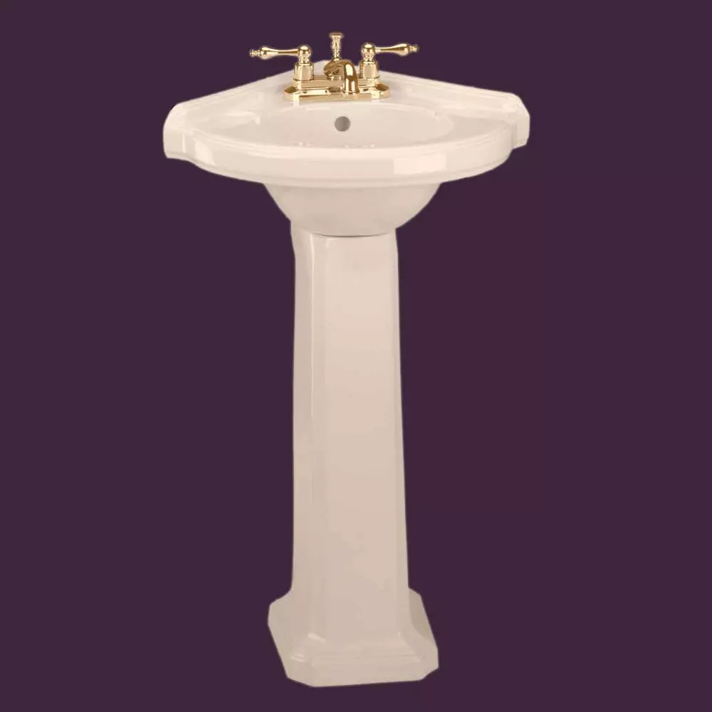 Renovator’s Supply Corner Sinks. Portsmouth Corner Classic Biscuit Classic Pedestal Sinks: Made of Porcelain these sinks endure daily wear and tear. Our protective finish resists common household stains and makes it an EASY CLEAN wipe-off surface. Ergonomic and elegant easy reach design reduces daily strain placed on your body. Maximizes limited bathroom space. Built in self draining soap dish. Partial open back classic Pedestal Sink for easy installation even with non-standard rough-ins. Accepts 4 inch center set or single hole faucet (with cover plate). Faucet sold separately. Measures 32 3/4 in. H x 22 in. W.