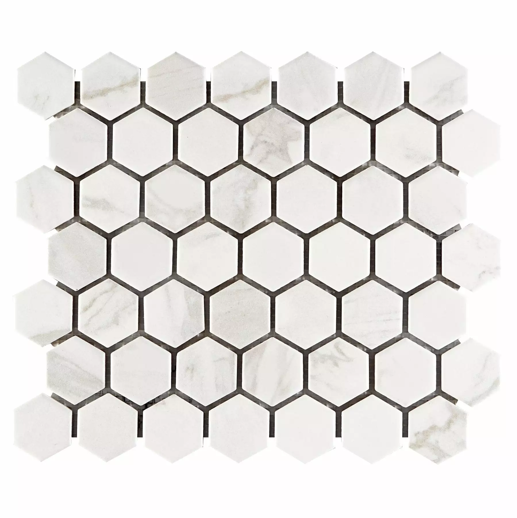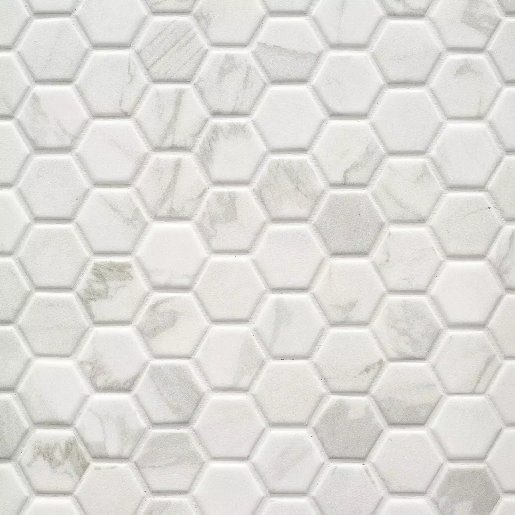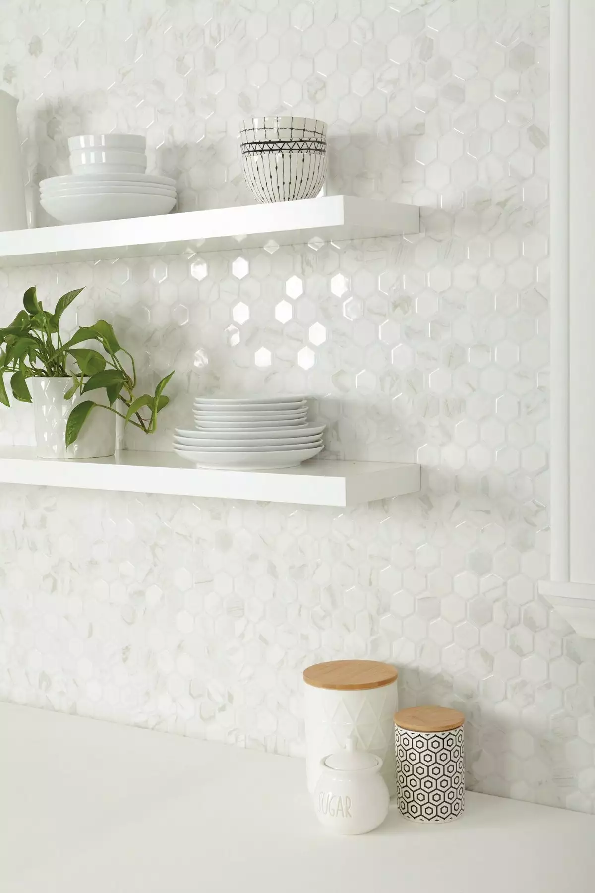 Make a statement with the 12 x 12 Marble Art 1.5 in. Hexagon Ceramic Mosaic. This tile is white and has a polished or high gloss finish, making it an excellent addition for your style and space.