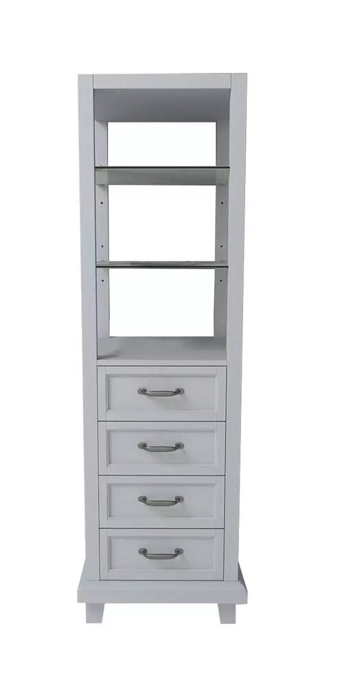 The Tuscany® Addison Collection Linen Cabinet offers versatile styling for any room. This Cabinet features four drawers and two glass shelves that provide extra space for household items. This Linen Cabinet is crafted with solid wood and wood veneer, it has durable features with several distinctive details, including bun feet and a recessed panel design, creating a piece that is both decorative and fully functional.