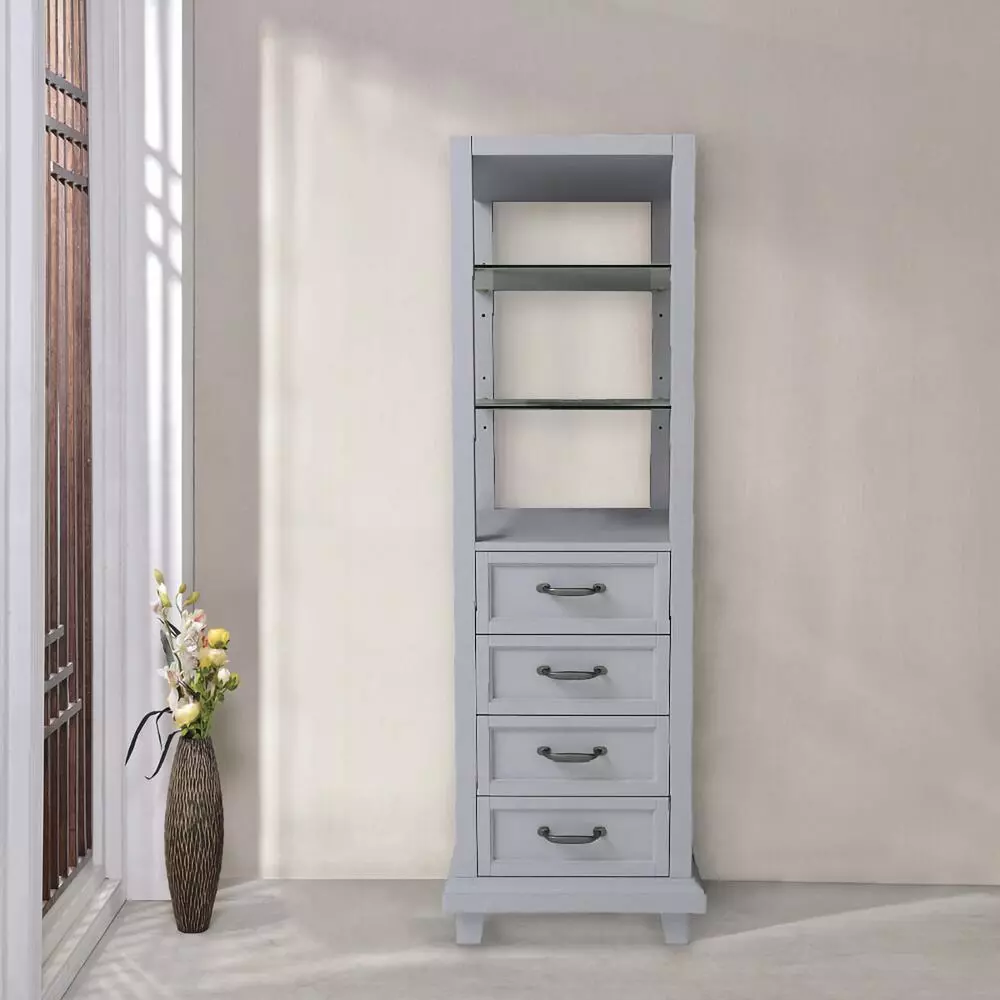 | Material | Solid wood, Soft close drawers, Cabinet has 2 glass shelves and 4 drawers, Sophisticated gray color, 18″W x 18″D x 60″H |