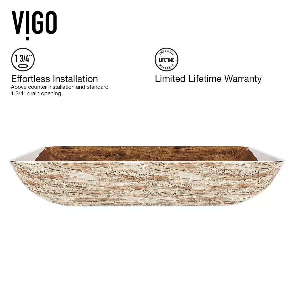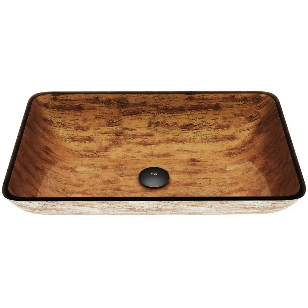 Solid tempered glass construction makes the VIGO Rectangular Amber Sunset Glass Vessel Bathroom Sink ideal for everyday use. The polished interior and textured exterior are stain-resistant and easy to clean. With a wood-grain pattern of rich browns, the vessel sink blends sophistication with nature to raise the element of style in any bathroom.