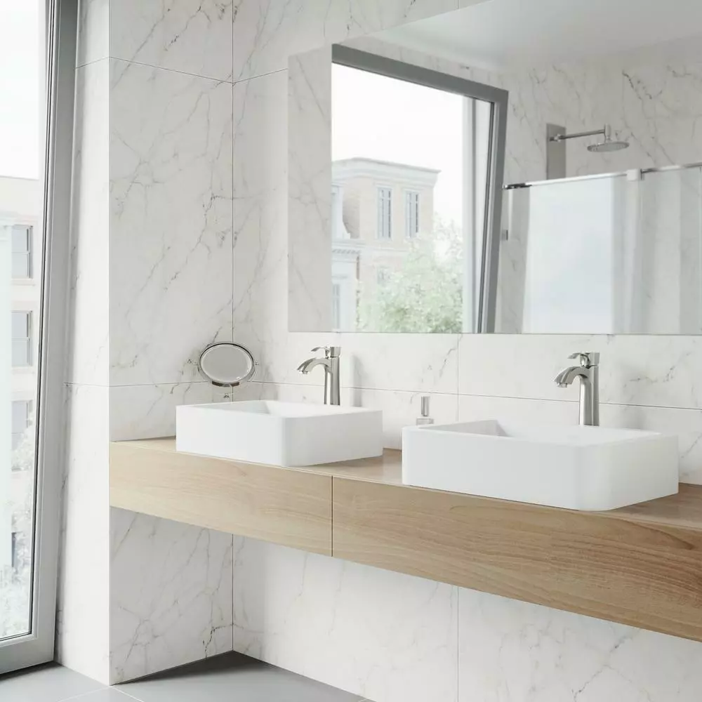 The seamless, solid core Matte StoneTM construction makes the VIGO Petunia Matte Stone Vessel Bathroom Sink extremely durable. Its surface is scratch and fade resistant and is easy to keep clean with the included buffing circle. The Petunia vessel sink brings a modern, elegant feel to any bathroom. Its bold rectangular shape and crisp white color complete this stylish piece.