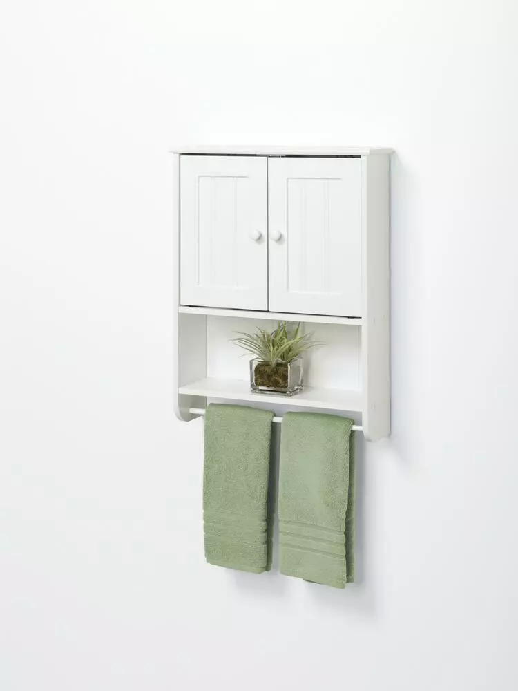 The 2-Door Country Cottage Wall Cabinet adds valuable storage to any bathroom with limited floor space. This attractive and functional cabinet has both open and hidden storage. A full-length towel bar is included for bathroom towels. The cabinet is easy to assemble and install. Wall mounting hardware is included.